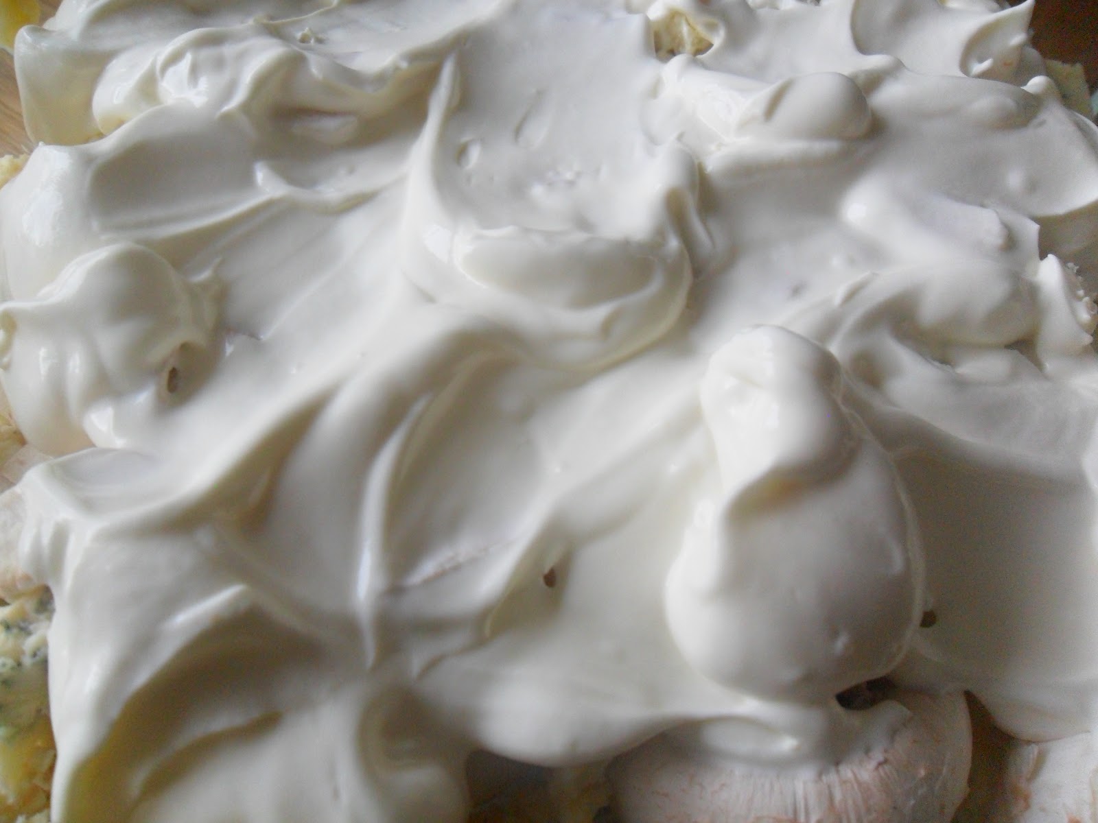 dish. Then scattered 250g of stilton, the sliced mushroom stalks (waste not, want not!), 300g of crème fraiche on top, in that order.